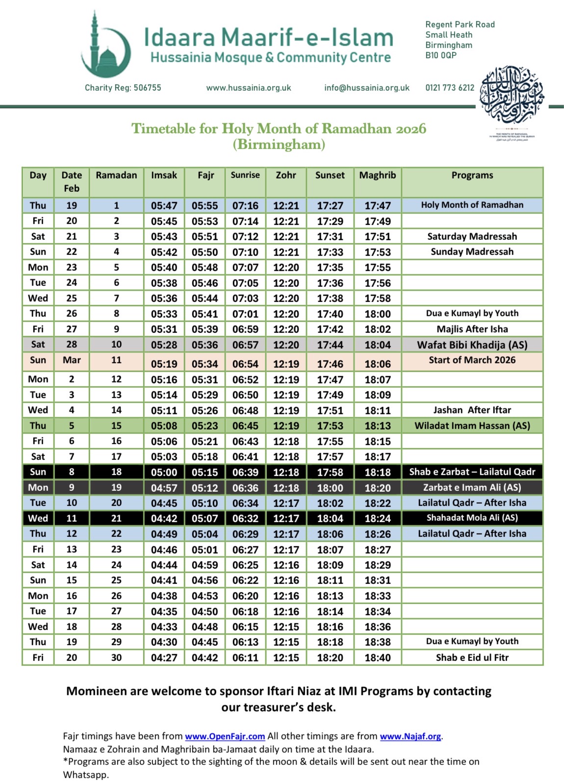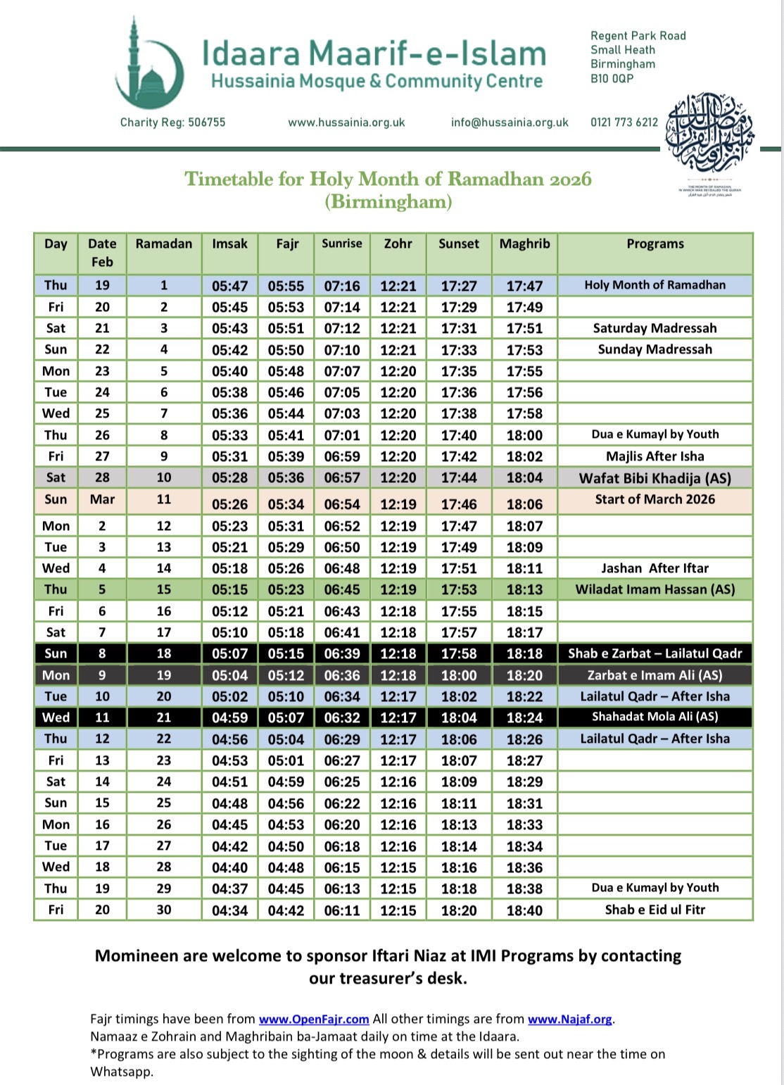 Please *email your name, address and payment method to info@hussainia.org.uk* once payment has been made.